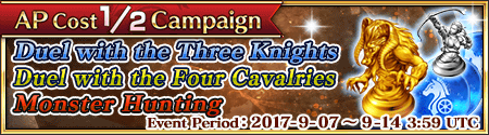 AP Costs for Daily Quests (Treasure Vaults, Duel with the Three Knights, Duel with the Four Cavalries, Monster Hunting) will all be 1/2!