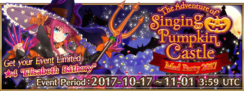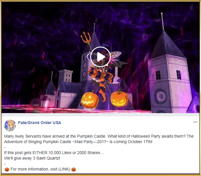 If you can help us get the pinned post "Adventure of Singing Pumpkin Castle - Mad Party 2017 Pre-Release Campaign!" on the official Fate/GO Facebook page to 10,000 likes OR 2,000 shares, every Master will receive 3 Saint Quartz!