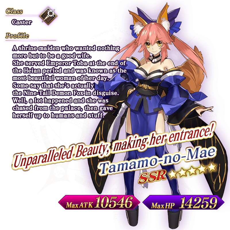 * Once the Pickup Period has ended, Tamamo-no-Mae will reappear as a Story Summon. However, she will only be available after the fourth Singularity opens.