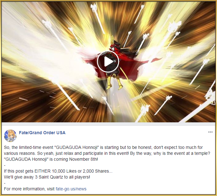 Since you helped us get the pinned post "GUDAGUDA Honnoji Pre-Release Campaign" to 10,000 Likes OR 2,000 Shares within the campaign period, every Master will receive 3 Saint Quartz!