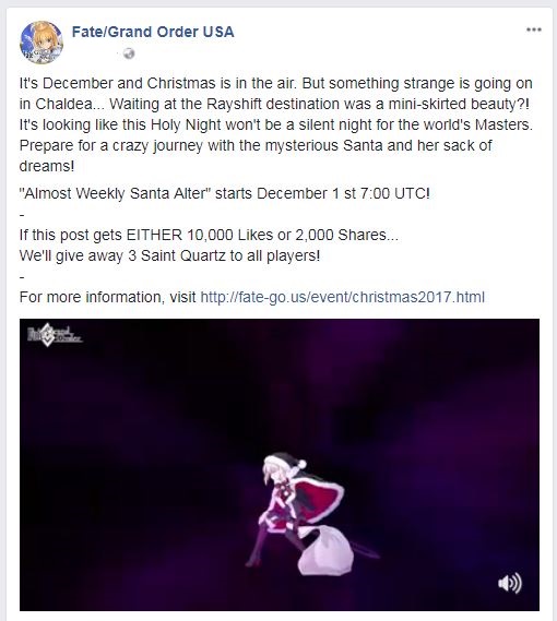 If you can get the pinned post "Almost Weekly Santa Alter Pre-Release Campaign" to 10,000 Likes OR 2,000 Shares within the campaign period, every Master will receive 3 Saint Quartz!