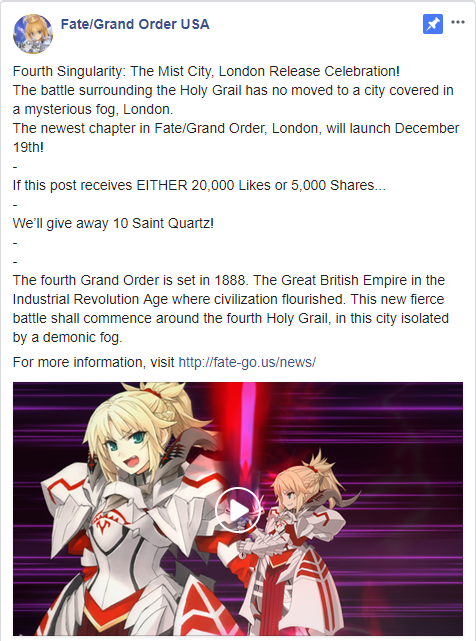 If you can help us get the pinned post "London Pre-Release Campaign" to 20,000 Likes OR 5,000 Shares within the campaign period, every Master will receive 10 Saint Quartz!