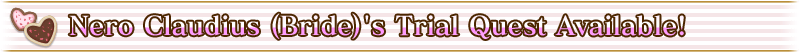 Add the new Servant "★5 (SSR) Nero Claudius (Bride)" to your party and take on her limited time Trial Quest! You won't want to miss this chance to try out Nero Claudius (Bride)'s skills and Noble Phantasm!