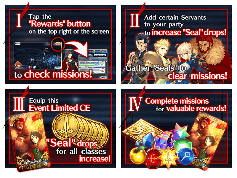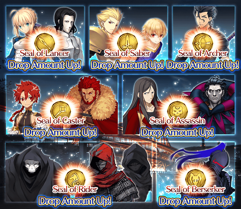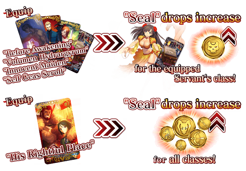 Equip the new Craft Essences (added to Saint Quartz Summon with this event) to increase the number of Seals per drop for the equipped Servant's class.
