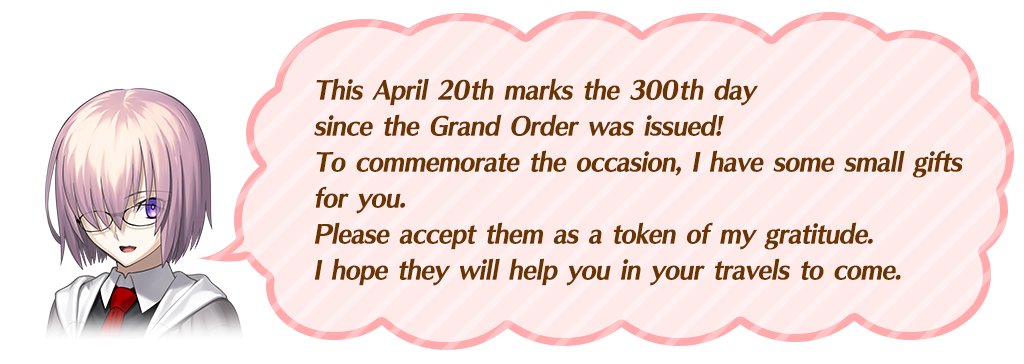 Presents will be sent to your Present Box upon initial login between 2018-04-20 21:00 - 04-27 20:59 PDT.