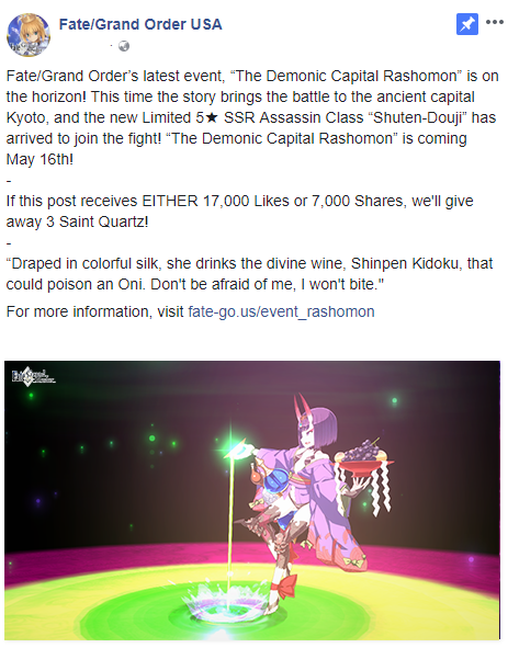 Since you helped us get the pinned post "The Demonic Capital: Rashomon Pre-Release Campaign" to 17,000 Likes OR 7,000 shares within the campaign period, every Master will receive 3 Saint Quartz!