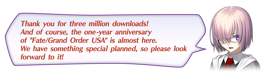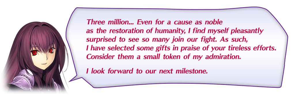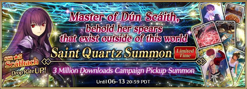 To celebrate 3 million total downloads, "★5 (SSR) Scáthach" will have an increased drop rate!