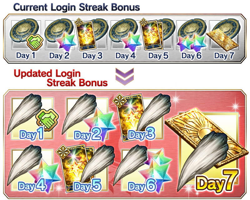 * Your login streak will not be reset when the login streak bonus is updated. Which day of the streak you are on will be carried over when counting the post update login bonus.