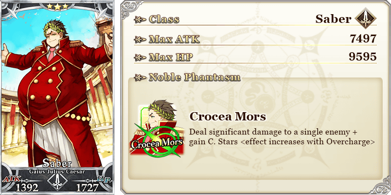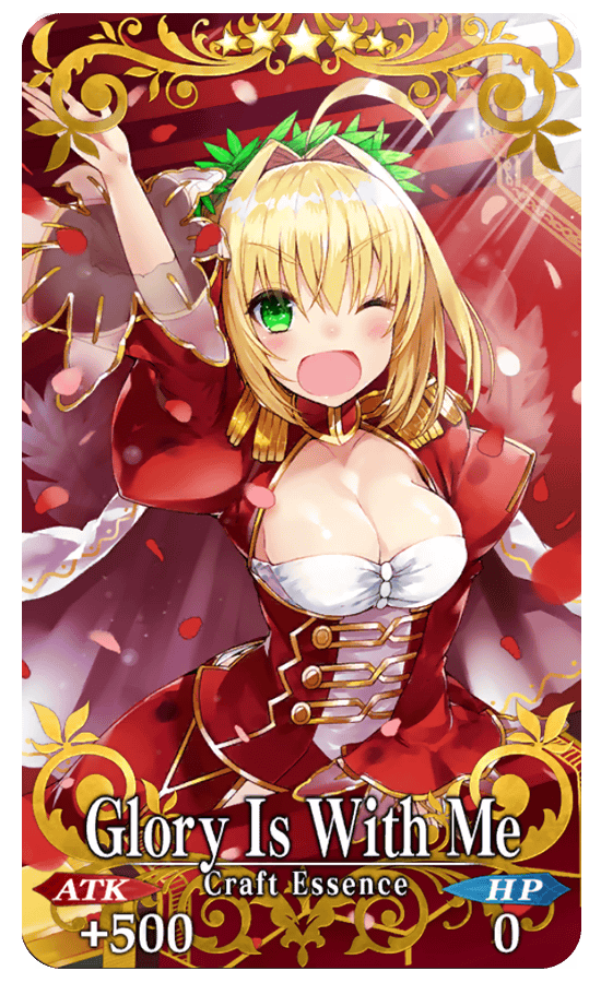★★★★★SSR Glory Is With Me ATK 500 (MAX: 2000) HP 0 Skill Increase NP Strength by 15% & Critical Strength by 15% & gain 3 C. Stars each turn for yourself + Increase Nero Medal (Gold) drop amount by 1 [Event only]