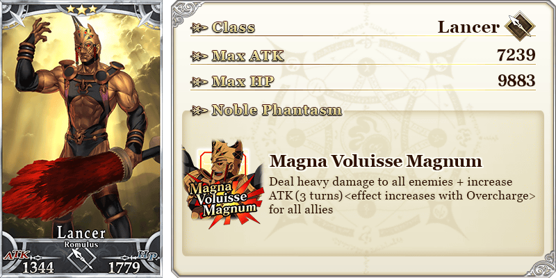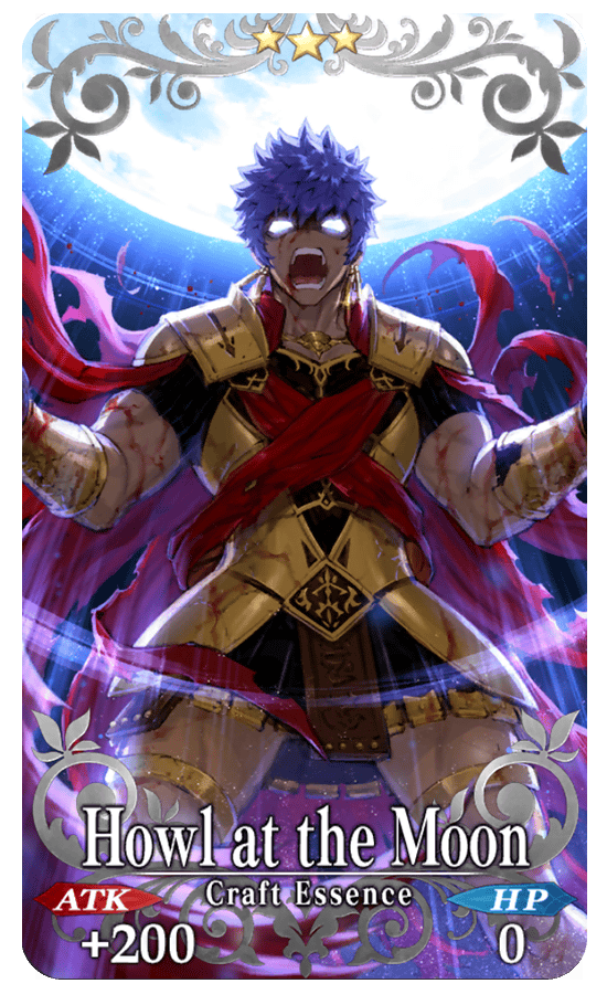 ★★★R Howl at the Moon ATK 200 (MAX: 1000) HP 0 Skill Increase Buster Card effectiveness by 10% & decrease Debuff Resist by 20% [Demerit] for yourself + Increase Nero Medal (Bronze) drop amount by 1 [Event only]