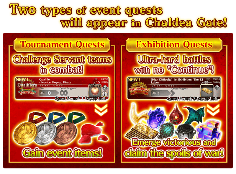 Battle against Servants in Tournament Quests to gain event items which can be traded for fabulous rewards.