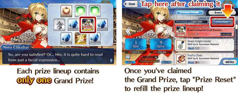 * From the 7th Prize Lineup on, there will be no Grand Prize. "Prize Reset" will become available after you have claimed all items.