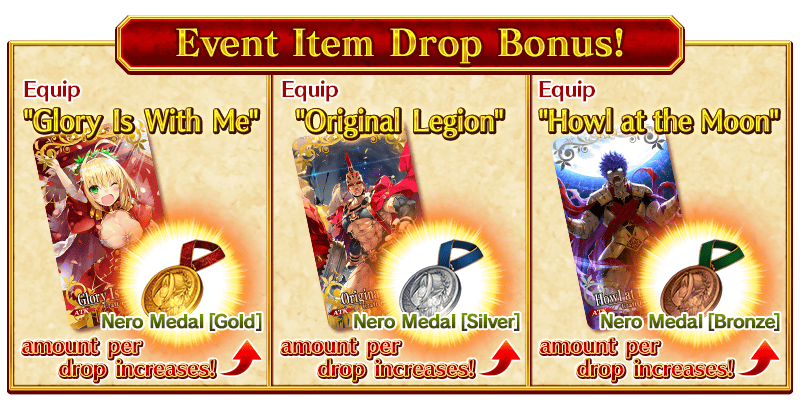 By equipping the Limited Time Craft Essences "★5 (SSR) Glory Is With Me," "★4 (SR) Original Legion," and "★3 (R) Howl at the Moon," you can gain a bonus to the number of Event Items "Nero Medal (Gold)," "Nero Medal (Silver)," or "Nero Medal (Bronze)" per drop.