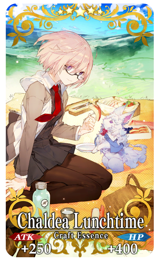 ★★★★★SSR Chaldea Lunchtime ATK 250 (MAX: 400) HP 1000 (MAX: 1600) Skill Increase Bond gained when completing a quest by 2% |