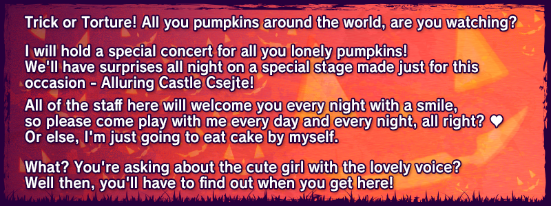 * This event is a Revival Lite version of the 2017 Limited Time Event "The Adventure of Singing Pumpkin Castle - Mad Party 2017". Certain elements, such as the number of event items required for exchange, have been adjusted.