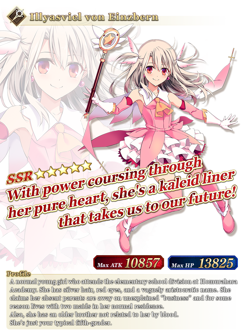 | 2018-11-24 23:00 - 11-25 22:59 PST | Illyasviel von Einzbern, Collaboration Event "Magical Girl Cruise - PRISMA CODES" Limited Time Craft Essences |