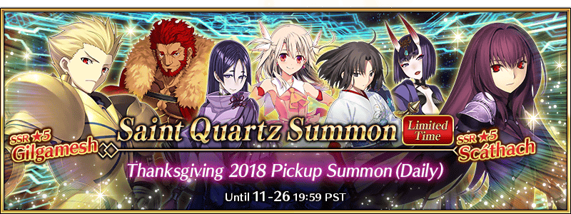 * The lineup for "Thanksgiving 2018 Pickup Summon (Daily)" will change daily. Limited Time Servants and Craft Essences will not be available for summon outside of their respective pickup periods. Please be sure to confirm the lineup before summoning.