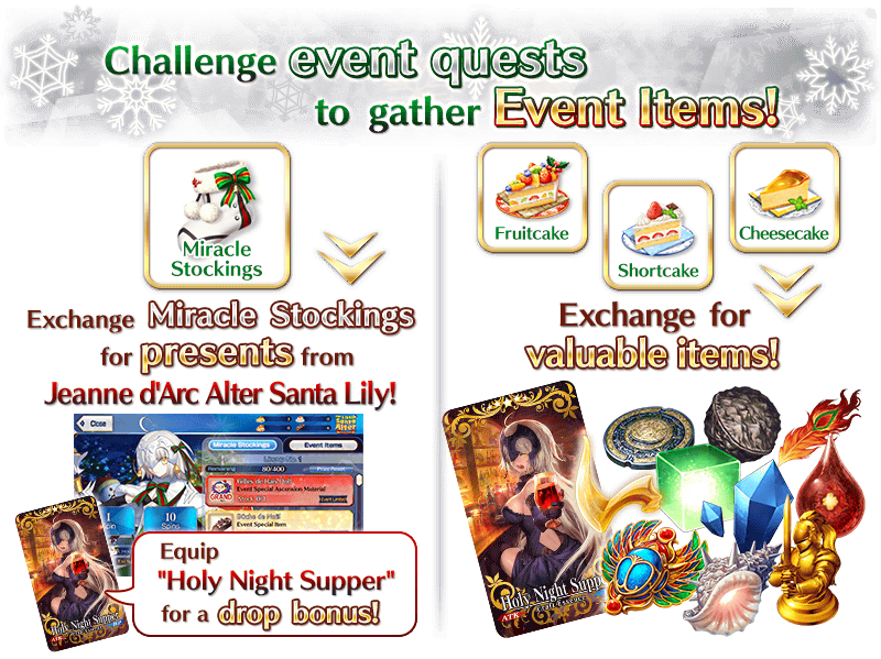 Gather "Miracle Stockings" through event quests to exchange for presents from Jeanne d'Arc Alter Santa Lily!