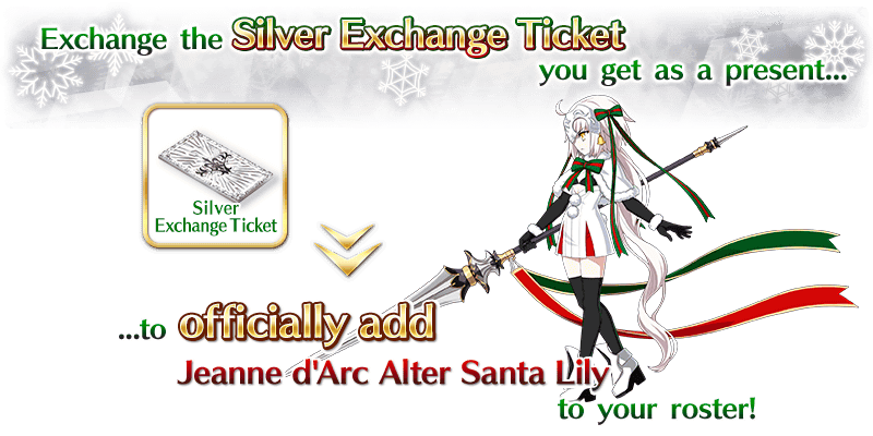 The "Silver Exchange Ticket" you receive from Miracle Stocking Exchange can be exchanged to officially add Jeanne d'Arc Alter Santa Lily to your roster after clearing "7th Night."