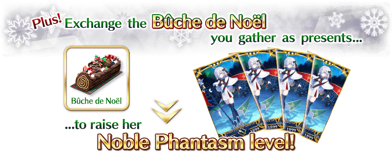 The event item "Bûche de Noël" will be available only through the Prize Roulette! It can be exchanged to increase Jeanne d'Arc Alter Santa Lily's Noble Phantasm level and for other rare items.