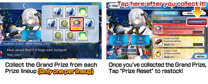 * From the seventh reset on, new Prize Lineups will not contain a Grand Prize, Golden Fruit, or Silver Fruit. "Prize Reset" will become available after claiming all items in the Prize Lineup.