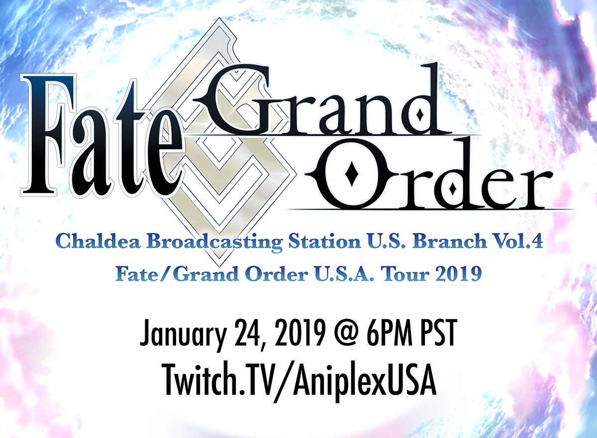 On Thursday, January 24th, tune in to a special live stream from Aniplex USA! Catch "Chaldea Broadcasting Station U.S. Branch Vol. 4, Fate/Grand Order U.S.A. Tour 2019 " on twitch.tv/aniplexusa!