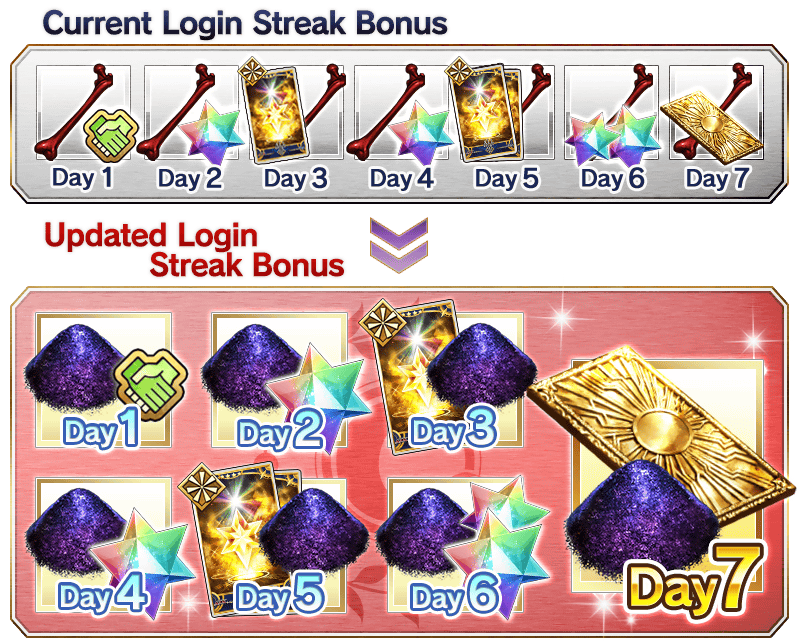 * Your login streak will not be reset when the login streak bonus is updated. Which day of the streak you are on will be carried over when counting the post update login bonus.