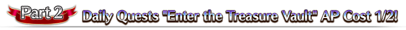 For a limited time, the daily “Enter the Treasure Vault" quests that appear within Chaldea Gate will have their AP costs halved! Novice, Intermediate, Advanced, and Expert level quests will all be eligible! Challenge “Enter the Treasure Vault Quests” to gather large amounts of QP!