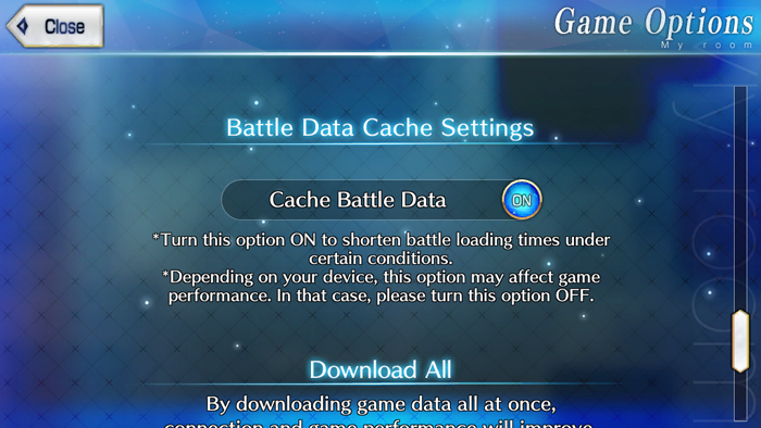 A "Battle Data Cache Settings" option has been added to Game Options in My Room. This option will shorten battle loading times under certain conditions. After the update, this option will be set to "ON" by default.
