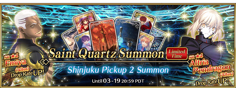This Pickup Summon will feature two Servants who play a major role in "Pseudo-Singularity I: Quarantined Territory of Malice, Shinjuku - Shinjuku Phantom Incident": "★4 (SR) Altria Pendragon (Alter)" and "★4 (SR) Emiya (Alter)"!