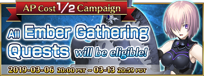 AP Costs for the "Ember Gathering" Daily Quests that appear in Chaldea Gate will be 1/2 for a limited time.