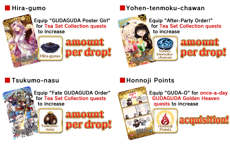 By equipping Event Limited and Limited Time Craft Essences, you can acquire more "Hira-gumo," "Yohen-tenmoku-chawan," "Tsukumo-nasu," and "Honnoji Points."