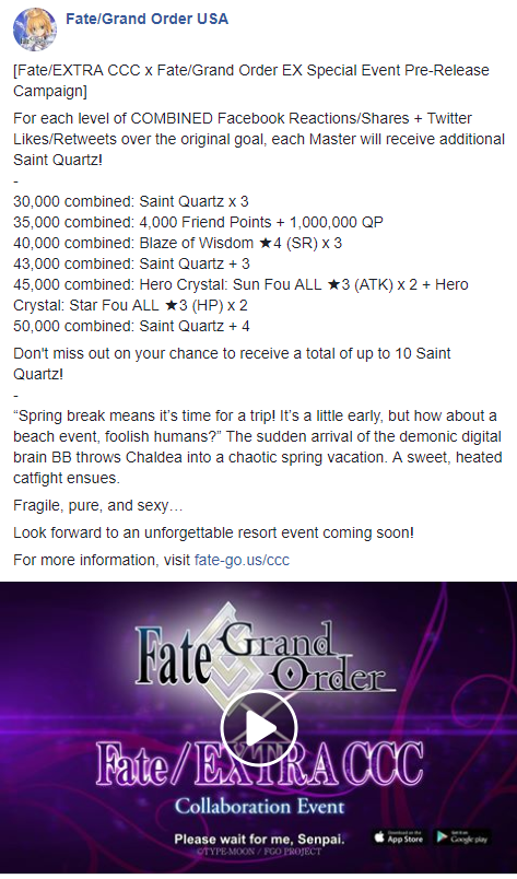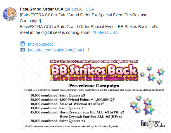 Since you were able to get the "Fate/EXTRA CCC x Fate/Grand Order EX Special Event Pre-Release Campaign" posts to a total of 50,000 Facebook Reactions/Shares and Twitter Likes/Retweets, all Masters will receive the following rewards!