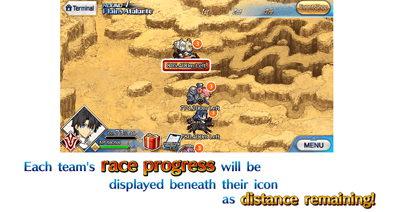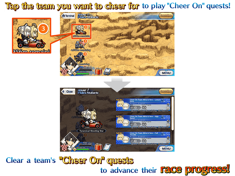 At certain points in the main quest of this event, repeatable "Cheer On" quests will appear. In these quests, the six teams will compete against each other in a race to the goal.