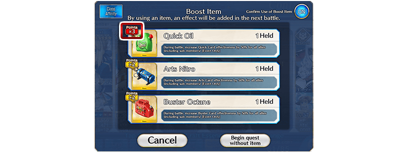 Use the Boost Items "Quick Oil," "Arts Nitro," and "Buster Octane," available through Event Item Exchange and as quest rewards, to gain a bonus effect in each team's "Cheer On" quests.
