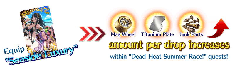 Equip the Event Limited Craft Essence "★5 (SSR) Seaside Luxury," available through Event Item Exchange, to gain a drop bonus for the event items Mag Wheel, Titanium Plate, and Junk Parts within the Limited Time Event "Dead Heat Summer Race! The Ishtar Cup of Hopes and Dreams 2019."