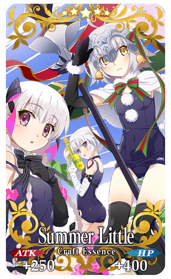 ★★★★★SSR Summer Little ATK 250 (MAX: 1000) HP 400 (MAX: 1600) Skill Increase NP Gain by 25% & NP Strength by 10% & Critical Strength by 10% for yourself + Increase amount of Mag Wheel per drop by 2 [Event Only] + Increase amount of Connacht Coin per drop by 2 [Event Only] * An event item bonus will be added for Part Two. Details will be given on the Part Two information page. (Added on August 5th) The Part Two event item name has been added to the skill effect.