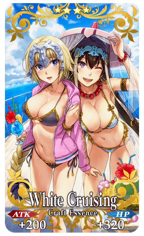 ★★★★SR White Cruising ATK 200 (MAX: 750) HP 320 (MAX: 1200) Skill Increase Arts Card effectiveness by 8% & Buster Card effectiveness by 8% & NP Gain by 8% for yourself + Increase amount of Titanium Plate per drop by 2 [Event Only] + Increase amount of Instant Noodles per drop by 2 [Event Only] * An event item bonus will be added for Part Two. Details will be given on the Part Two information page. (Added on August 5th) The Part Two event item name has been added to the skill effect.