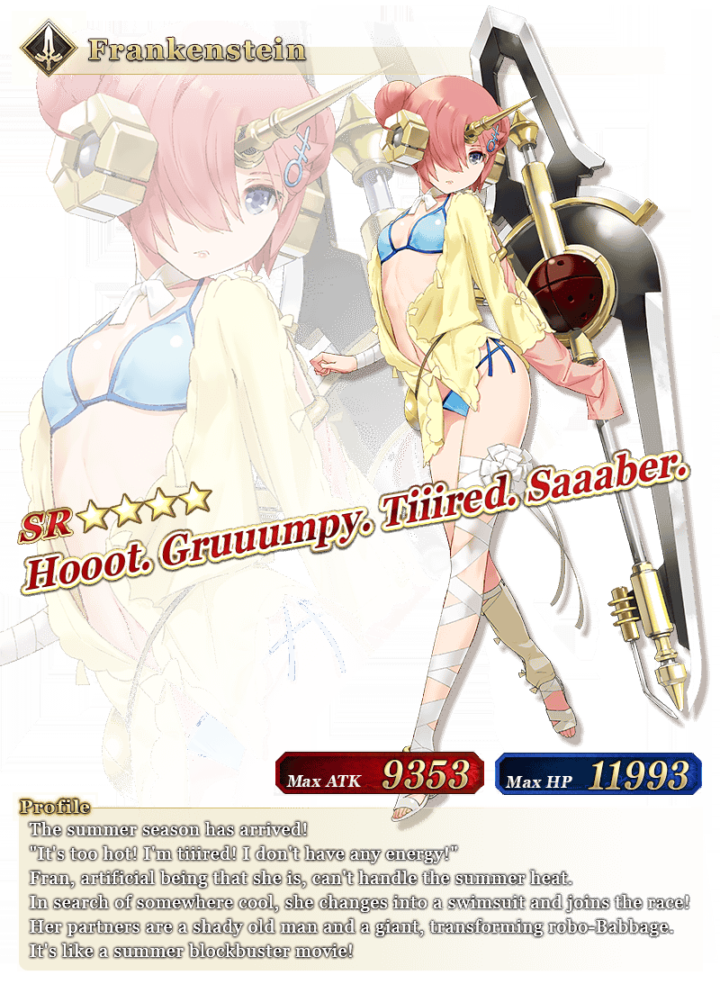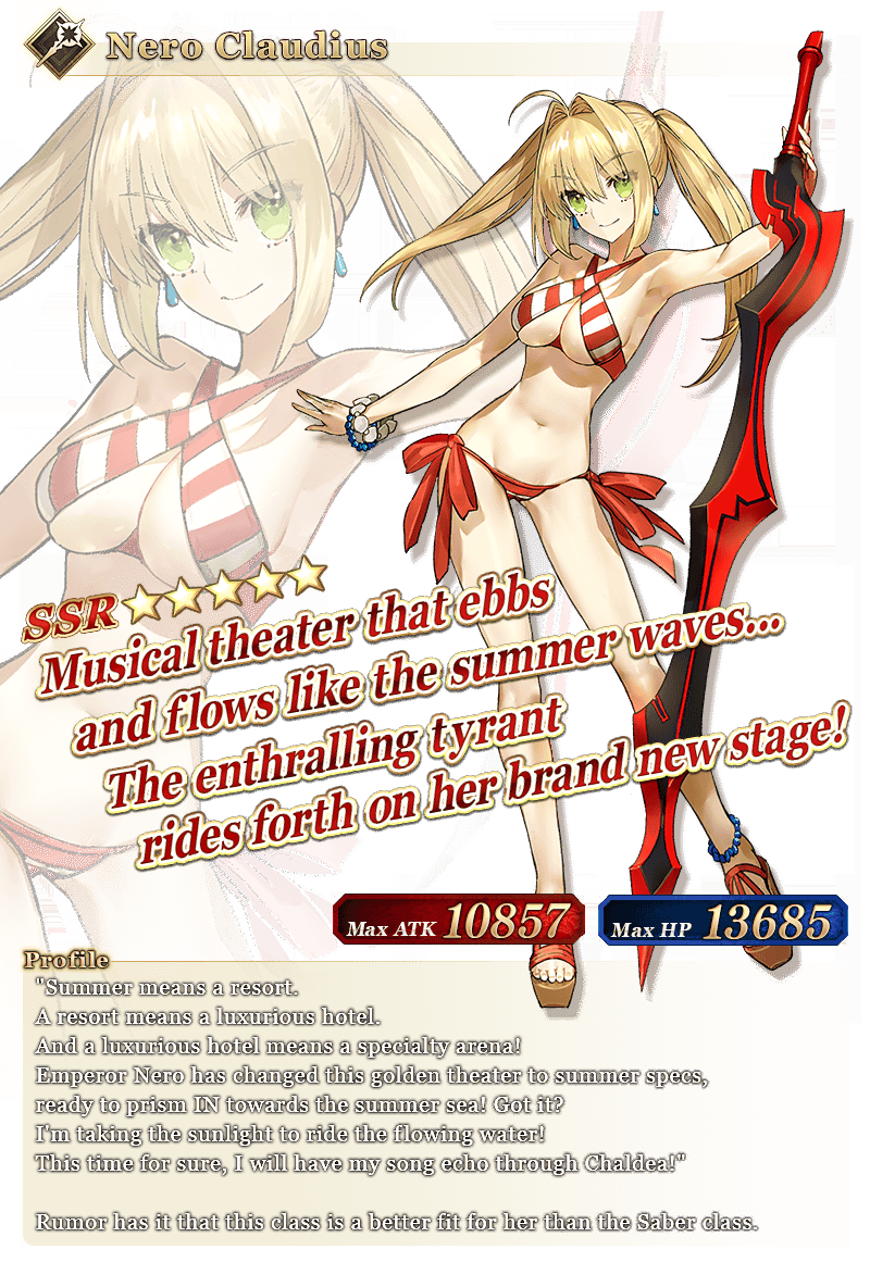 Limited Time Servants "★5 (SSR) Nero Claudius (Caster)," "★4 (SR) Frankenstein (Saber)," "★4 (SR) Nitocris (Assassin)," and "★4 (SR) Oda Nobunaga (Berserker)" are ready for summer!