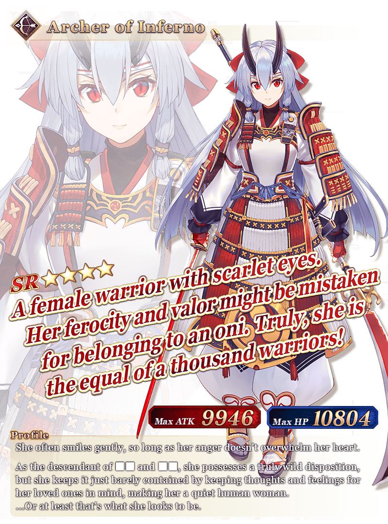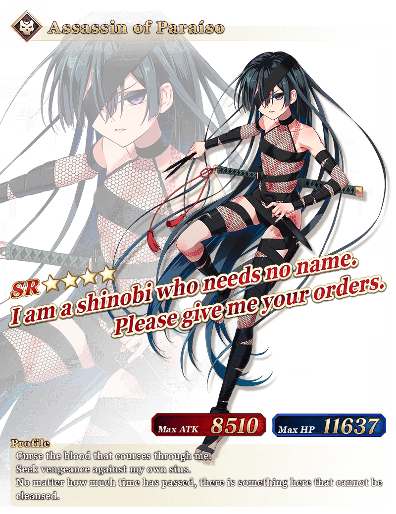 From the above four Servants, "★4 (SR) Archer of Inferno" and "★4 (SR) Assassin of Paraíso" will be featured on a daily rotation. "★5 (SSR) Miyamoto Musashi" and "★3 (R) Houzouin Inshun" will have an increased drop rate for the duration of the Pickup Summon!