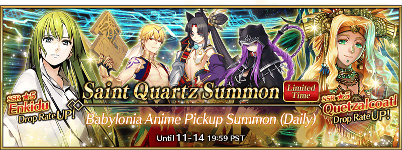 * As the lineup for the Babylonia Anime Pickup Summon (Daily) will change daily, Quetzalcoatl will not be summonable on certain days. Please be sure to confirm the lineup before summoning.