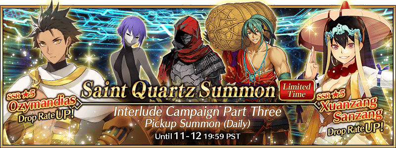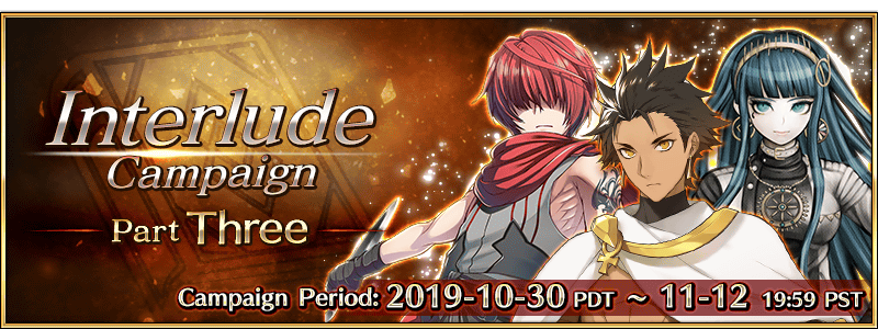 * The following Servants' Interludes are also included in an ongoing AP Cost 1/2 Campaign that goes from 2019-10-20 21:00 PDT to 11-07 19:59 PST. This period will be extended to 11-12 19:59 PST to match the end date and time of "Interlude Campaign: Part Three”.