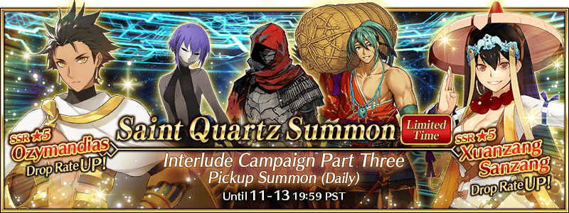 “★5 (SSR) Ozymandias” and “★5 (SSR) Xuanzang Sanzang,” who have just had new Interludes added in “Interlude Campaign Part Three,” will be summonable with an increased drop rate on a daily rotation!