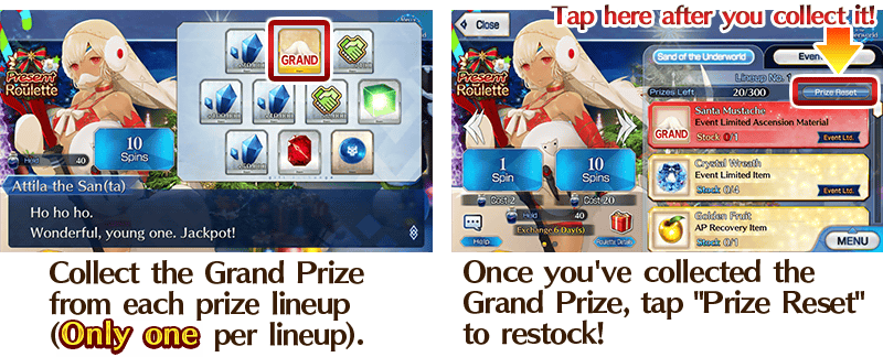 [Grand Prize] Lineups 1 - 4: Event Limited Ascension Material "Santa Mustache" Lineup 5: War God Exchange Ticket * Can be exchanged for Attila the San(ta) after clearing Main Quest Section 8. Lineup 6: Crystallized Lore Lineups 7 - 10 Hero Crystal: Corona Fou ALL ★4 (ATK) [Event Items] Crystal Wreath * Can be exchanged for additional copies of Attila the San(ta) to increase her Noble Phantasm level after exchanging the War God Exchange Ticket. [Skill Enhancement & Ascension Materials] Homunculus Baby Ghost Lantern Mystic Spinal Fluid Seed of Yggdrasil [Skill Enhancement Materials] Secret Gem of Saber Secret Gem of Archer Secret Gem of Lancer Secret Gem of Rider Secret Gem of Caster Secret Gem of Assassin Secret Gem of Berserker Magic Gem of Saber Magic Gem of Archer Magic Gem of Lancer Magic Gem of Rider Magic Gem of Caster Magic Gem of Assassin Magic Gem of Berserker Gem of Saber Gem of Archer Gem of Lancer Gem of Rider Gem of Caster Gem of Assassin Gem of Berserker [Other Items] Blaze of Wisdom ALL ★4 (SR) Fire of Wisdom ALL ★3 (R) Golden Fruit Silver Fruit Bronze Fruit Mana Prism Friend Point QP |