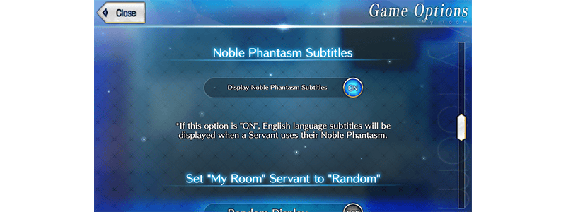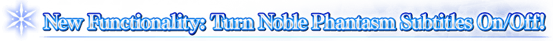 A "Noble Phantasm Subtitles" option has been added to "Game Options" in My Room. You will be able to select whether or not to display Noble Phantasm subtitles in battle.
