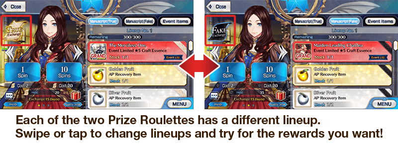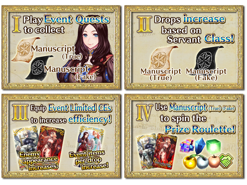 Gather Manuscript (True) and Manuscript (Fake) through Event Quests, and exchange them at the Manuscript (True) and (Fake) Roulettes!