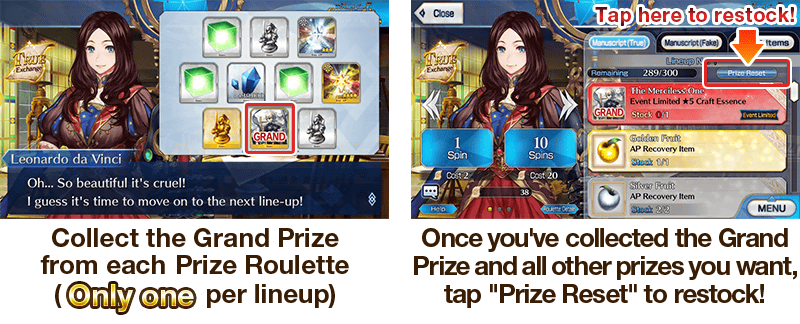 Each Manuscript Roulette has 10 lineups which contain a Grand Prize!