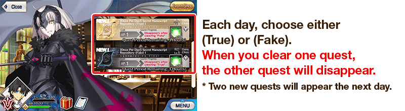 Two Bonus Quests will be unlocked each day, allowing you to gather large amounts of either Manuscript (True) or Manuscript (Fake).