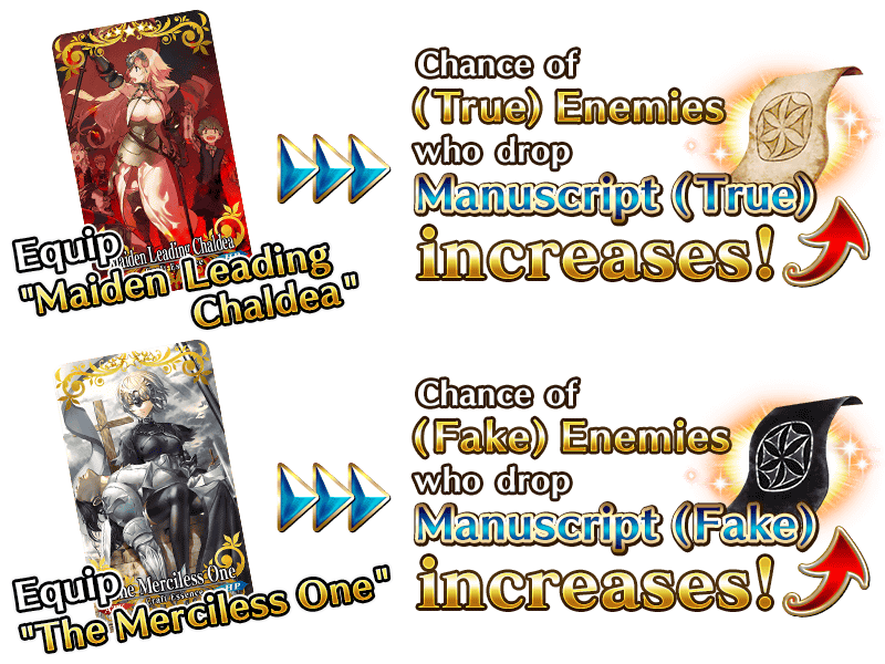 These Event Items can be exchanged for an Event Limited Craft Essence which increases the amount of both Manuscript (True) and Manuscript (Fake) per drop.