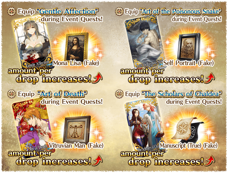 Equip the Craft Essences featured in the ongoing Pickup Summon to increase the amount per drop for Event Items "Mona Lisa (Fake)," "Self Portrait (Fake)," and "Vitruvian Man (Fake)."